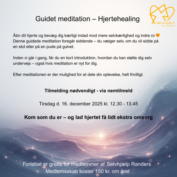 Vi har nu fastsat to nye datoer for guidede meditationer med vores frivillige, Lone. Du er velkommen til at deltage i den ene eller begge, og det gør ikke noget, hvis du aldrig har prøvet meditation før – arrangementet er for alle.